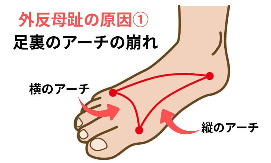 特に外反母趾に深く関わっているのが横アーチの崩れです。 横アーチが崩れることで、足の幅が広がり、親指の付け根が外側へ押し出されやすくなります。 さらに指先がうまく使えず、足裏全体のバランスが乱れ、結果的に外反母趾を引き起こす土台となってしまいます。