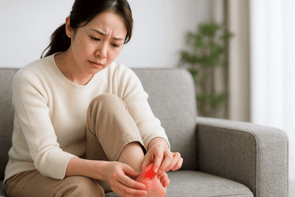 さらに、足のバランスが崩れることで膝や腰への負担が増し、膝痛・股関節痛・腰痛へと波及することもあります。